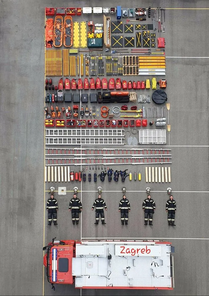 Содержимое хорватской пожарной машины вместе с пожарными.© reddit/Slopz_