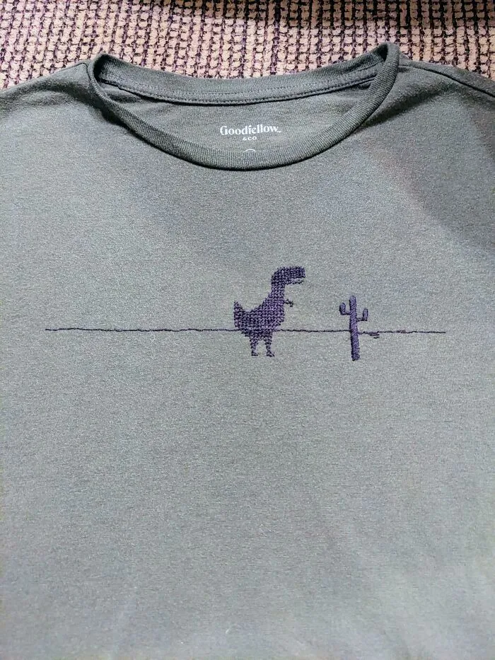 «Вышитый маленький динозаврик, чтобы скрыть пятно от соуса для барбекю».© reddit.com/Lovingbutdifferent