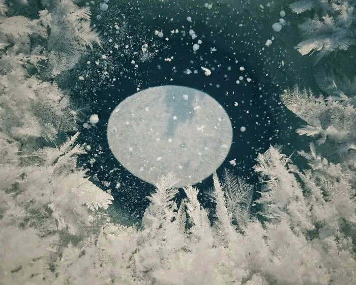 «Этот пузырь в замерзшей лунке для зимней рыбалки выглядит как луна, восходящая над лесом».© reddit.com/JephriB