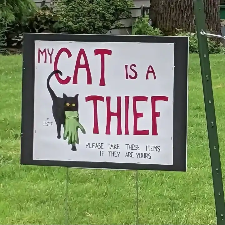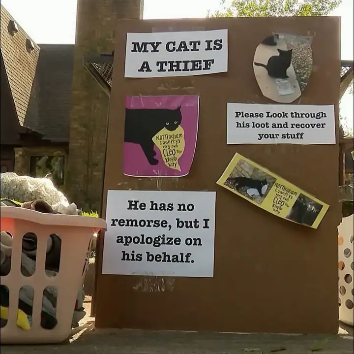 Из-за кота-воришки, который систематически тащил в дом соседские вещи, его хозяйка пошла на крайние меры: она устроила уличную выставку краденого, сопроводив ее крупным объявлением.