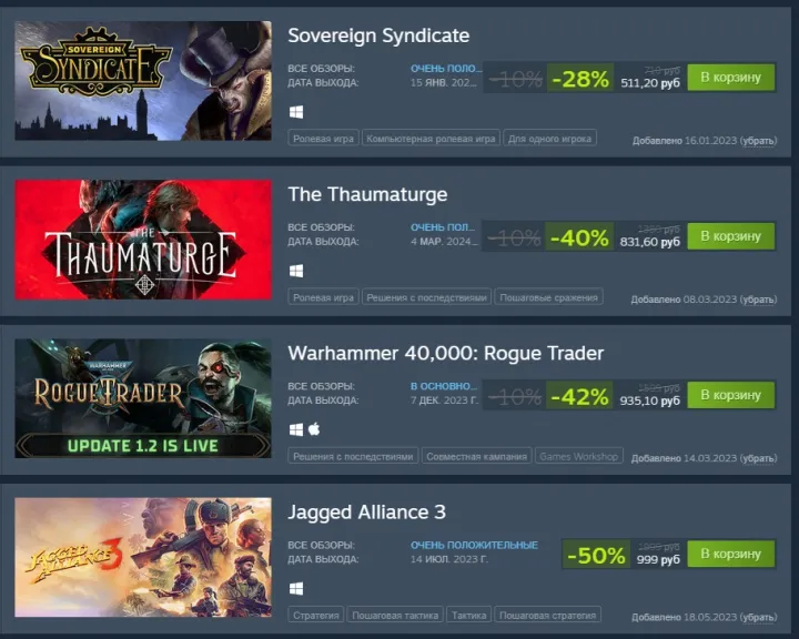 Из безусловных фаворитов — Batman: Arkham Knight, Disco Elysium, Civilization 6 и другая классика, которая сейчас уходит со скидкой в целых 90%. Радует и снижение цен среди новичков: так, завоевавший любовь поклонников симулятор средневекового лорда Manor Lords получил скидку 25% и стоит всего 1124 рублей. Одна из лучших стратегий этого года Solium Infernum получила скидку аж 60%, поэтому сейчас её можно взять по привлекательной цене 780 рублей.