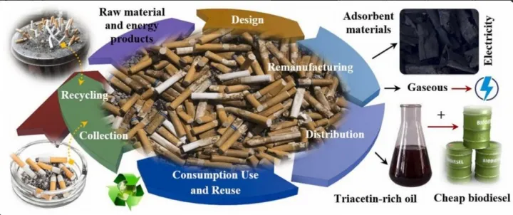Поскольку табак является токсичным отходом, его утилизация требует особой осторожности, поэтому команда отказалась разделять сигарету на компоненты при переработке. Для экспериментов был выбран метод пиролиза при температурах 650, 700 и 750 °C. Максимальное количество триацетина (43%) было получено при температуре 750 °C, при этом исследователи также получили из окурков масло, уголь и газ. Угольный продукт оказался пористым и богатым кальцием, поэтому учёные уже предложили использовать его как абсорбент в промышленности.