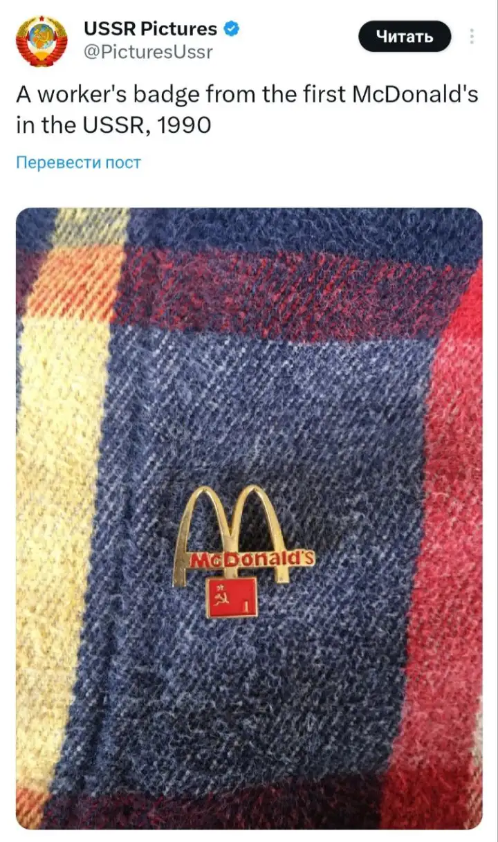 «Бейдж работника первого Макдоналдса в СССР, 1990».© x.com/@PicturesUssr