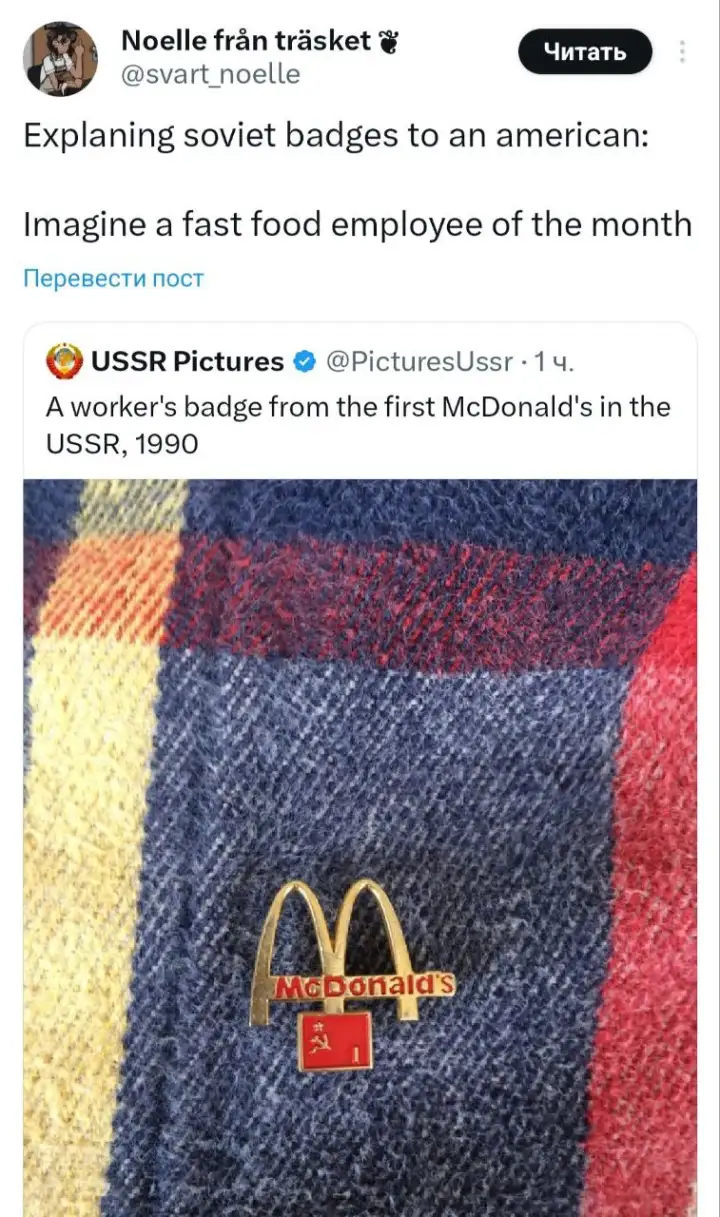«Объяснение советских значков американцу: Представьте себе сотрудника месяца в сети быстрого питания».© x.com/@svart_noelle