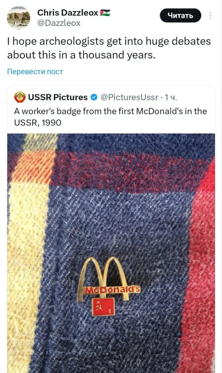 В англоязычных соцсетях массово обсуждают необычный коллаж: логотип McDonald’s на фоне советского флага. Многие иностранные пользователи в шоке: они спорят, не нейросеть ли это создала или это вообще фейк. Однако это исторический факт.