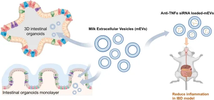 Учёные проверили свою теорию на крысах, сперва спровоцировав у зверьков воспаление кишечника. После этого молочные везикулы (mEV) нагрузили противоопухолевым фактором некроза альфа и ввели однократную дозу крысам. В итоге лечение уменьшило воспаление в толстой кишке у этих подопытных животных по сравнению с контрольной группой, а это означает, что mEV успешно доставили груз РНК в кишечник.