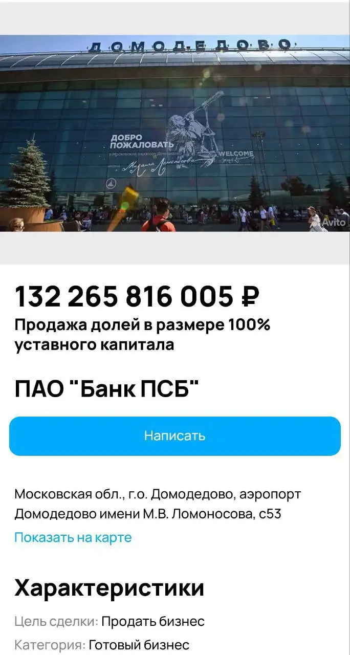 Столичный аэропорт Домодедово выложили на продажу на Авито. Стоимость — 132 млрд рублей. Стоит отметить, что это стартовая цена. Торги назначены на 20 января, однако подать заявку можно уже сейчас.