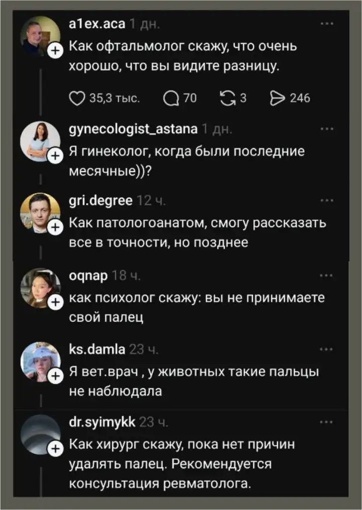 Когда молодой человек в соцсетях поделился своей тревогой из-за небольшого отличия — пальца другого цвета, он не ожидал такой реакции. Специалисты из разных областей устроили настоящий флешмоб в комментариях, превратив его пост в комедийное шоу.