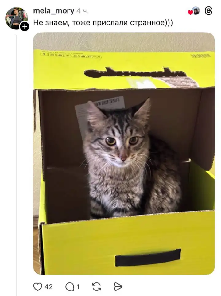 Всем повсеместно приходили в заказе КОТЫ.© threads.com*